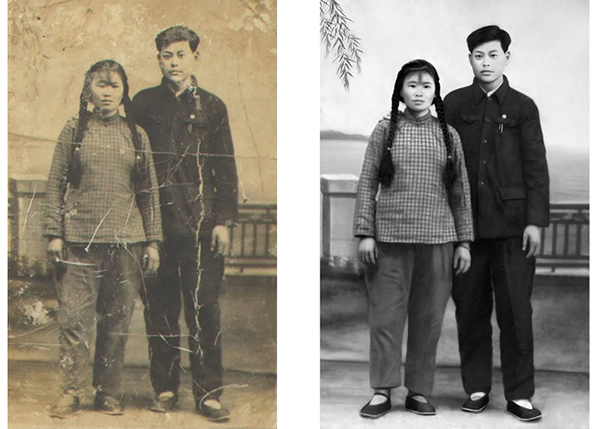 修复老照片最基本的一点就是注意细节,尽量保持原照风格修改,最近在修复完成后流行做一种真皮效果,其实也就是用相似的年龄段皮肤进行不透明度移植,这里不做演示,大家可以去尝试一下。